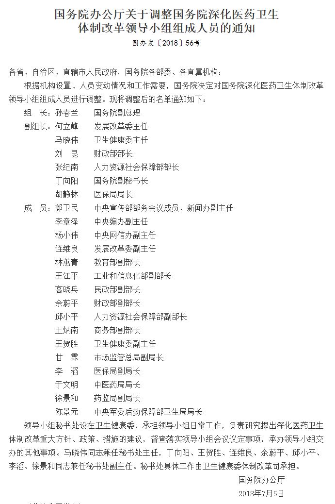 7月12日,中國(guó)政府網(wǎng)發(fā)布《國(guó)務(wù)院辦公廳關(guān)于調(diào)整國(guó)務(wù)院深化醫(yī)藥衛(wèi)生體制改革領(lǐng)導(dǎo)小組組成人員的通知(國(guó)辦發(fā)〔2018〕56號(hào))》,深化醫(yī)藥衛(wèi)生體制改革領(lǐng)導(dǎo)小組(簡(jiǎn)稱“深改組”)組成人員獲調(diào)整,組長(zhǎng)為國(guó)務(wù)院副總理孫春蘭,副組長(zhǎng)分別為發(fā)展改革委主任何立峰、衛(wèi)生健康委主任馬曉偉、財(cái)政部部長(zhǎng)劉昆、人力資源社會(huì)保障部部長(zhǎng)張紀(jì)南、國(guó)務(wù)院副秘書長(zhǎng)丁向陽(yáng)、醫(yī)保局局長(zhǎng)胡靜林。